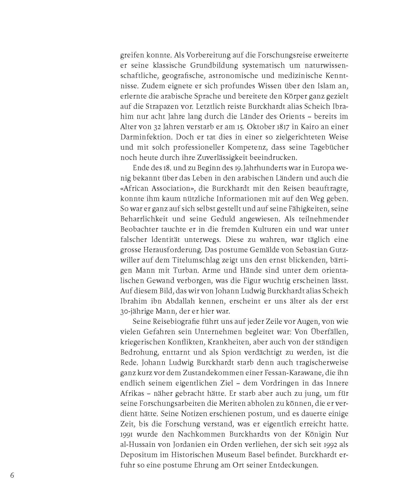 Die Biografie erzählt das Leben des Baslers Johann Ludwig Burckhardt, der als Sohn eines Handelsherrn seine Kindheit im Haus zum Kirschgarten verbracht hatte. Im Auftrag einer britischen Forschungsgesellschaft bereiste er unter dem Namen Scheich Ibrahim Ibn Abdalla zwischen 1809–1817 den Nahen Osten. Seine Fähigkeit, sich in fremde Kulturen einzuleben und dennoch objektiv über sie zu schreiben, macht ihn zu einem einzigartigen Zeitzeugen arabischer Lebenswelten. Für die Archäologie spielt Burckhardt als (Wieder-)Entdecker der Felsenstadt Petra und des grossen ägyptischen Tempels von Abu Simbel eine wichtige Rolle. Als einer der ersten Europäer beschrieb er zudem die Wahabiten, was einigen seiner Texte eine beklemmende Aktualität verleiht.