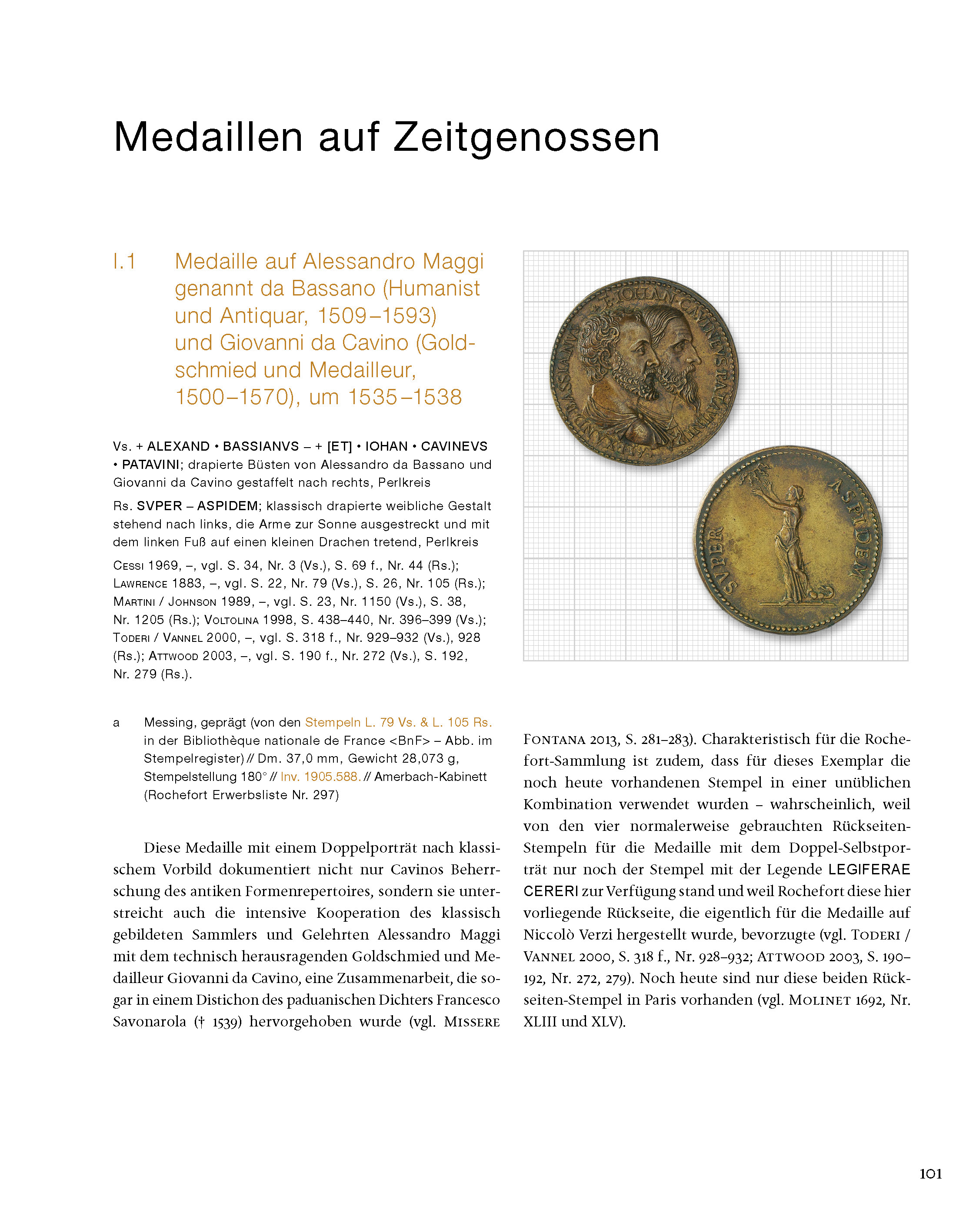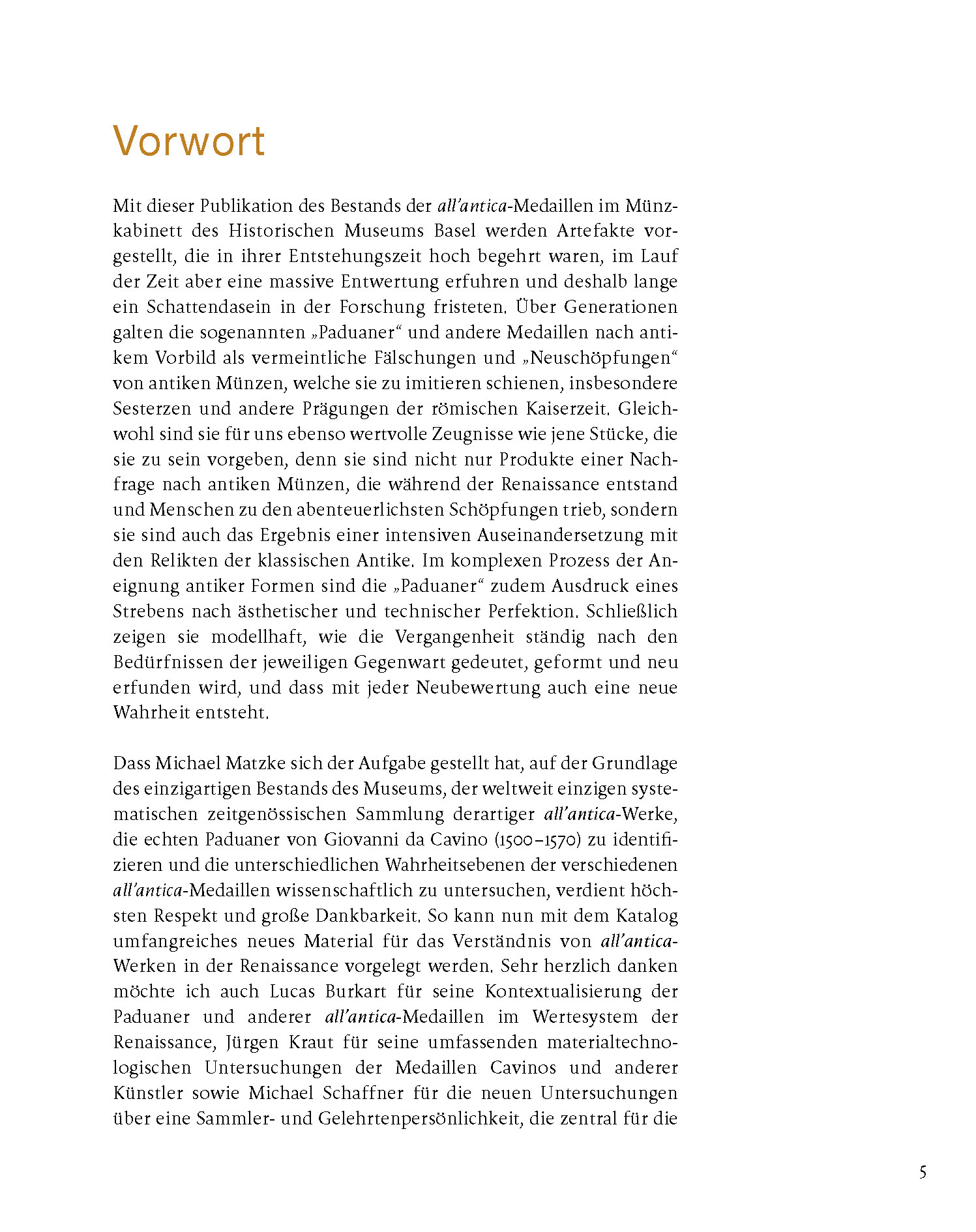 Echt oder Fälschung – die ewige Frage bei den «Paduanern» von Giovanni da Cavino (1500–1570). Die Sammlung des Historischen Museums Basel reicht bis ins 16. Jahrhundert zurück und umfasst nachweislich zahlreiche originale Medaillen. Der kommentierte Katalog des weltweit einzigartigen Bestands von «Paduanern» und anderen all’antica-Medaillen ist ein Referenzwerk für solche pseudo-antiken Werke und veranschaulicht eindrücklich deren hohe künstlerische Qualität und Intentionen. Es erschließt sich ein Kosmos der antiken Welt in den Augen der Renaissance.