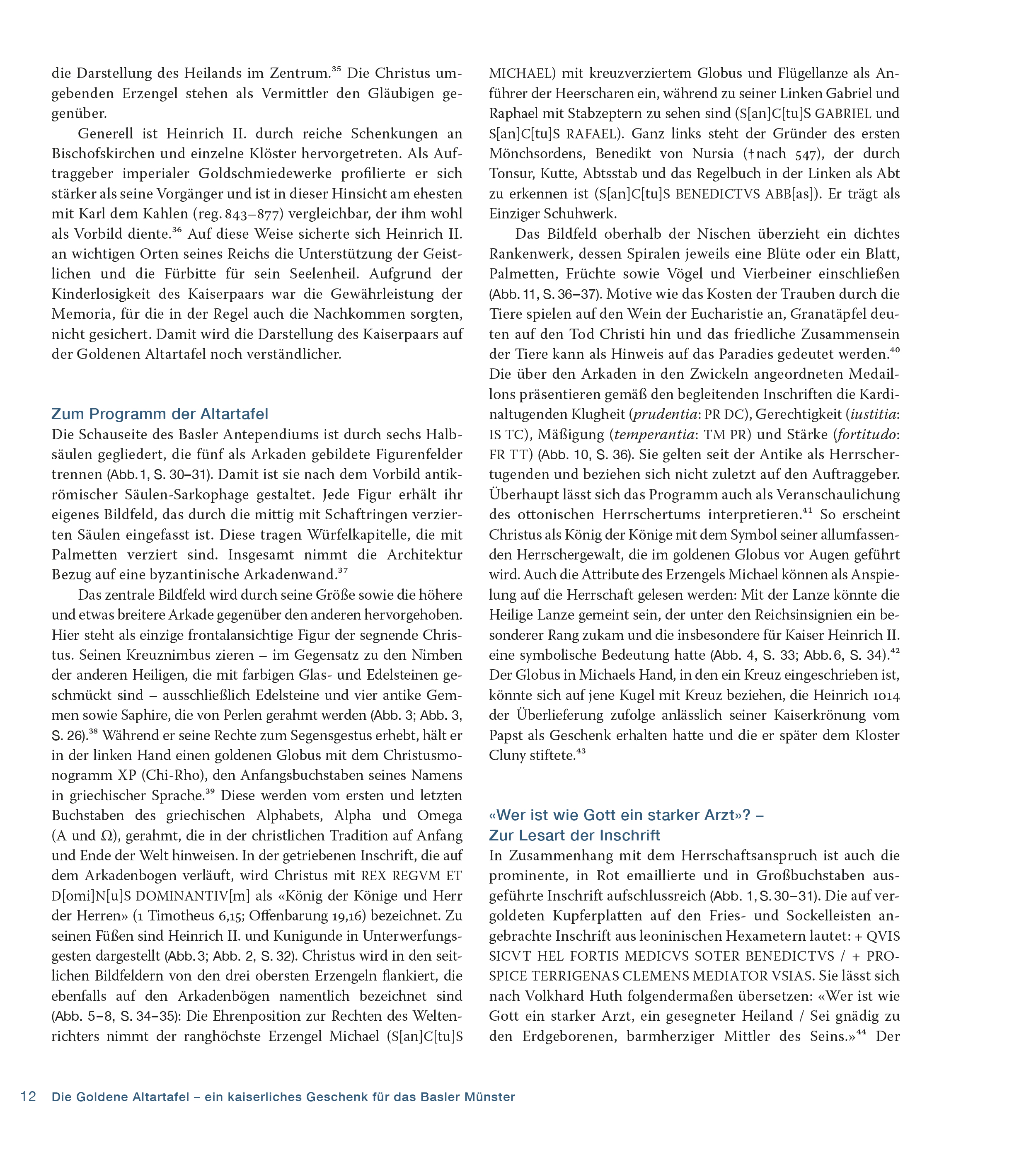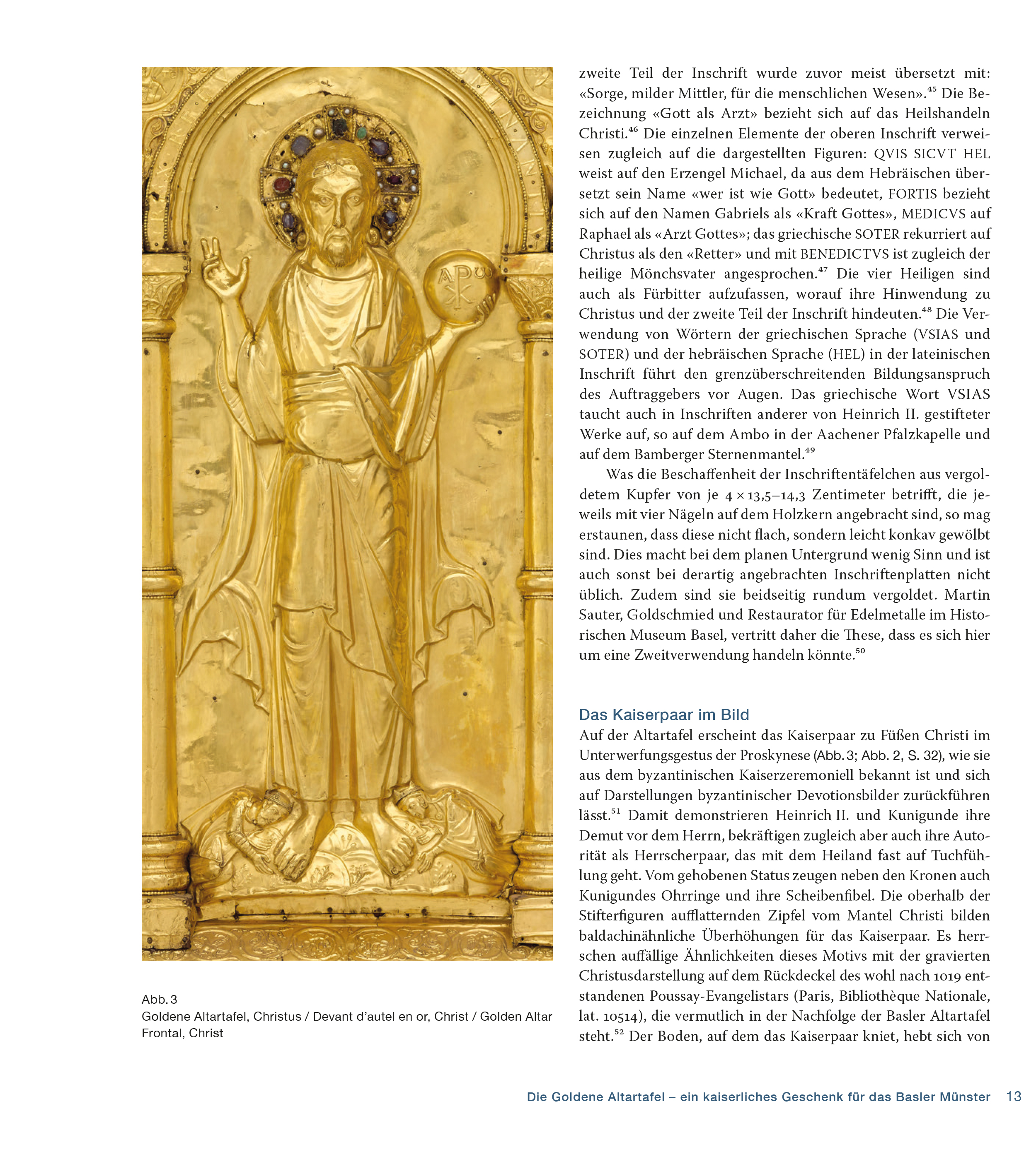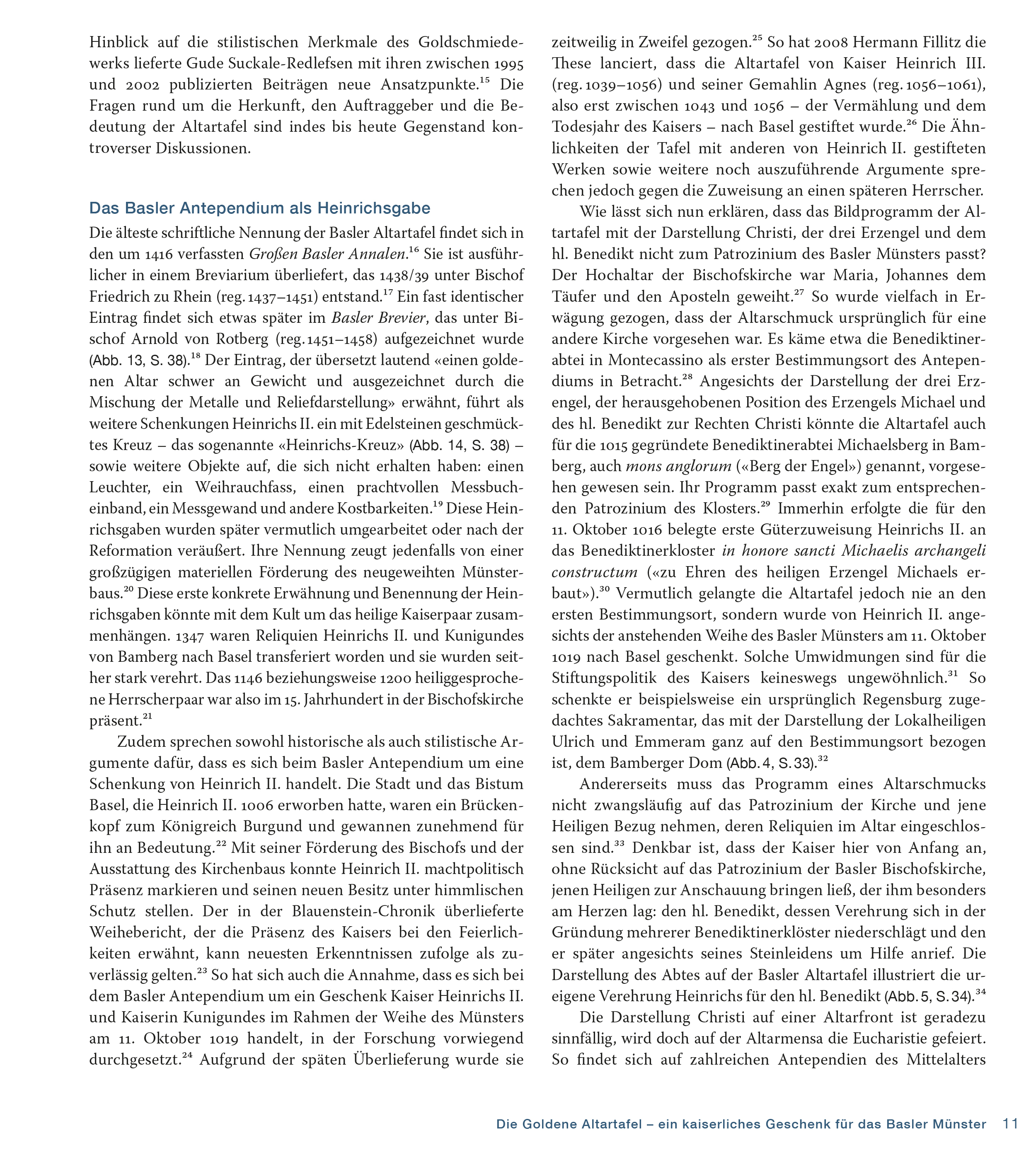 Dreisprachige Publikation über die die Goldene Altartafel aus dem Basler Münsterschatz. Am 11. Oktober 1019 wurde das Basler Münster in Anwesenheit von Kaiser Heinrich II. (reg. 1002–1024) geweiht. Die Goldene Altartafel, die der ostfränkisch-deutsche Kaiser Heinrich II. wohl anlässlich der Weihe der Basler Bischofskirche schenkte, bildete zusammen mit dem sogenannten Heinrichskreuz (Staatliche Museen zu Berlin, Kunstgewerbemuseum) das Kernstück des Basler Münsterschatzes. Über fünfhundert Jahre lang brachte die Goldene Altartafel an den höchsten Feiertagen des Jahres den Hochaltar des Basler Münsters zum Strahlen.