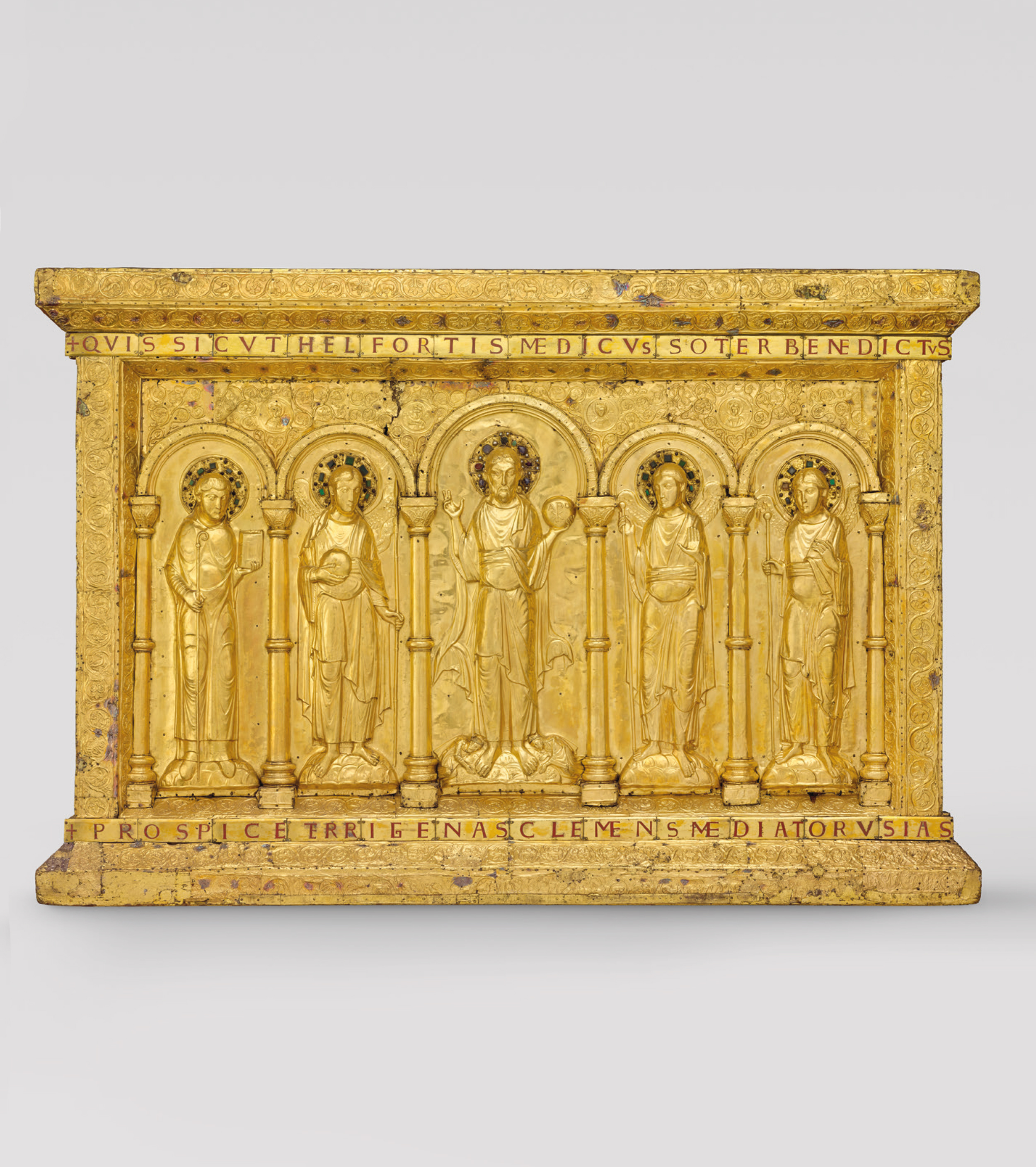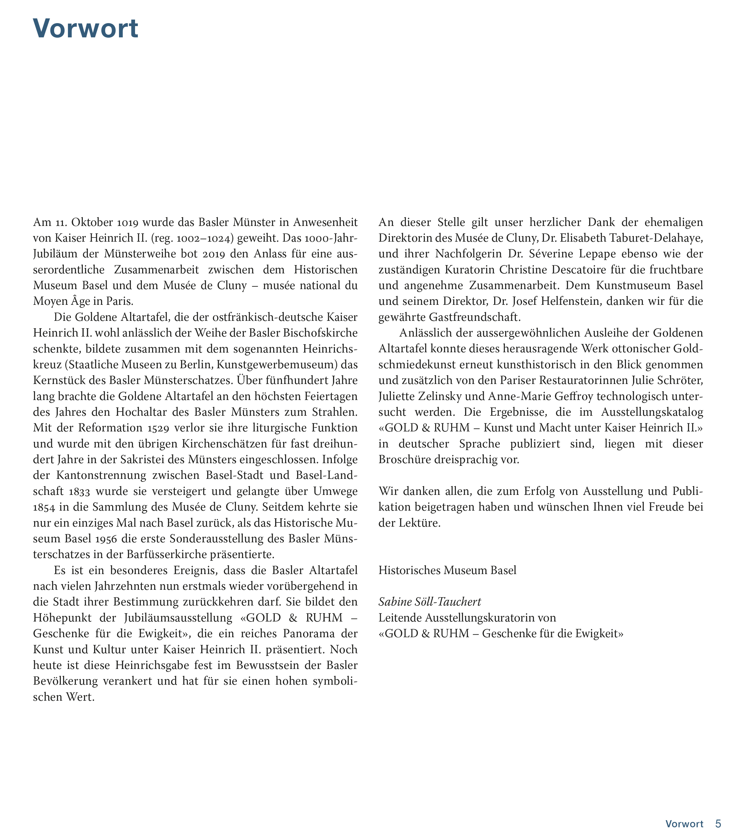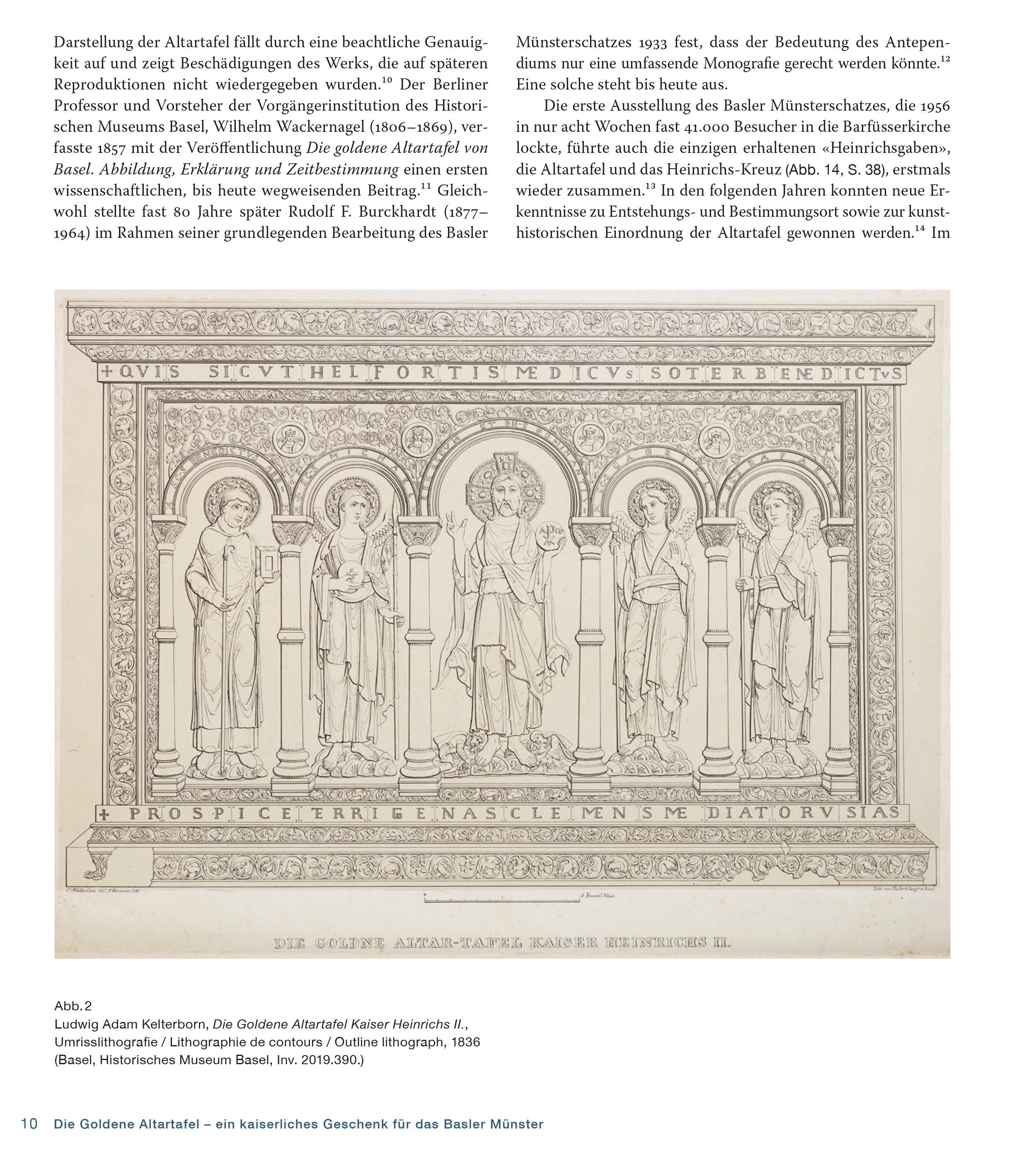 Dreisprachige Publikation über die die Goldene Altartafel aus dem Basler Münsterschatz. Am 11. Oktober 1019 wurde das Basler Münster in Anwesenheit von Kaiser Heinrich II. (reg. 1002–1024) geweiht. Die Goldene Altartafel, die der ostfränkisch-deutsche Kaiser Heinrich II. wohl anlässlich der Weihe der Basler Bischofskirche schenkte, bildete zusammen mit dem sogenannten Heinrichskreuz (Staatliche Museen zu Berlin, Kunstgewerbemuseum) das Kernstück des Basler Münsterschatzes. Über fünfhundert Jahre lang brachte die Goldene Altartafel an den höchsten Feiertagen des Jahres den Hochaltar des Basler Münsters zum Strahlen.