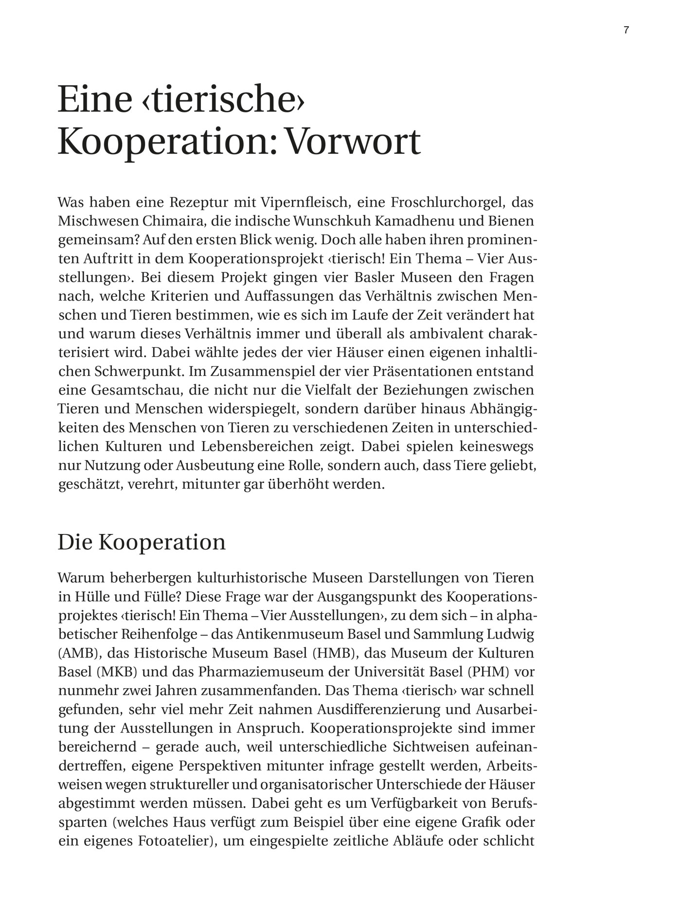 Für dieses ambitionierte Projekt zum Verhältnis von Menschen und Tieren schlossen sich vier kulturhistorische Museen in Basel zusammen. Im Sommer 2021 realisierten sie zu jeweils unterschiedlichen Schwerpunkten vier individuelle Ausstellungen. Das Antikenmuseum Basel und Sammlung Ludwig, das Historische Museum Basel, das Museum der Kulturen Basel und das Pharmaziemuseum der Universität Basel beschäftigen sich vor dem Hintergrund ihres jeweiligen Forschungsschwerpunkts aus unterschiedlichen Blickwinkeln mit der Thematik. Die Ergebnisse der Einzelprojekte werden in dieser gemeinsamen Publikation sichtbar. Sie offenbart Ambivalenzen, Abhängigkeiten und gravierende historische Verschiebungen innerhalb des Mensch-Tier-Verhältnisses über die Jahrhunderte – vom Nutzbarmachen von Tieren bis zu ihrer Überhöhung als Gottheiten. «Tierisch! Ein Thema – Vier Ausstellungen in Basel» ist ein vom Antikenmuseum Basel und Sammlung Ludwig, vom Historischen Museum Basel, vom Museum der Kulturen Basel und vom Pharmaziemuseum der Universität Basel initiiertes Projekt, das in vier Ausstellungen sowie eine gemeinsame Publikation mündet.