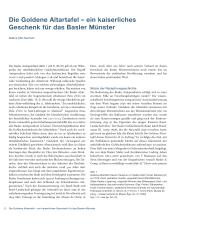 Dreisprachige Publikation über die die Goldene Altartafel aus dem Basler Münsterschatz. Am 11. Oktober 1019 wurde das Basler Münster in Anwesenheit von Kaiser Heinrich II. (reg. 1002–1024) geweiht. Die Goldene Altartafel, die der ostfränkisch-deutsche Kaiser Heinrich II. wohl anlässlich der Weihe der Basler Bischofskirche schenkte, bildete zusammen mit dem sogenannten Heinrichskreuz (Staatliche Museen zu Berlin, Kunstgewerbemuseum) das Kernstück des Basler Münsterschatzes. Über fünfhundert Jahre lang brachte die Goldene Altartafel an den höchsten Feiertagen des Jahres den Hochaltar des Basler Münsters zum Strahlen.