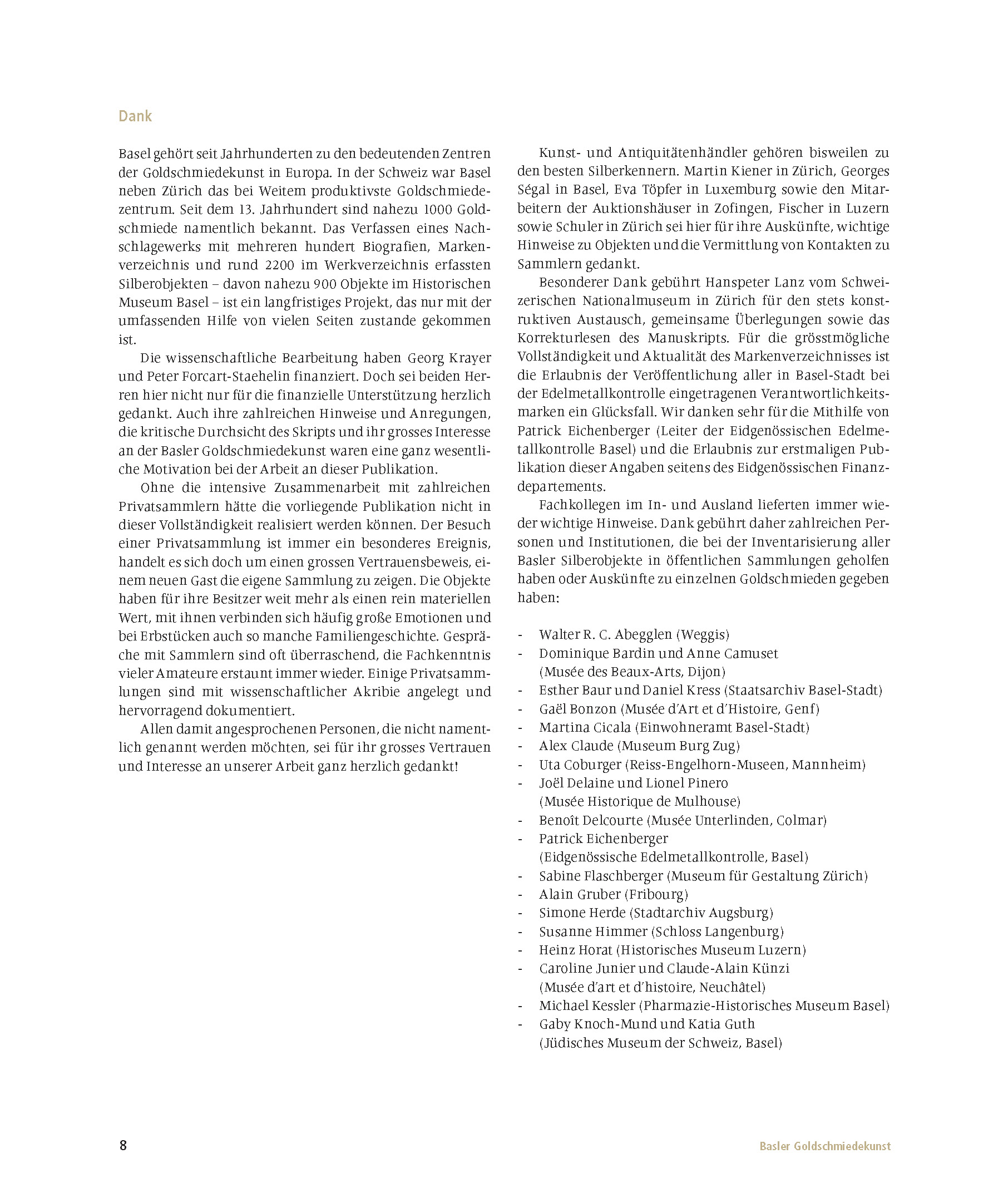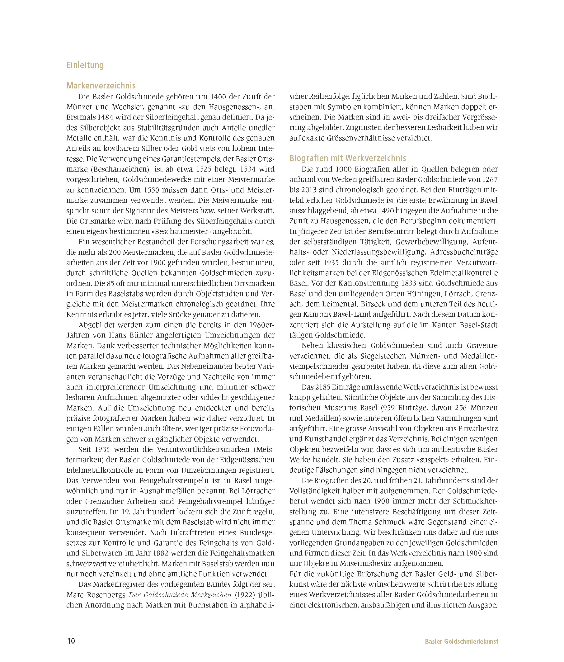 Basel war ein herausragendes Goldschmiedezentrum der Schweiz. Seit nahezu 750 Jahren lassen sich rund 1000 Goldschmiede namentlich identifizieren. Erstmals werden in diesem Nachschlagewerk alle in Basel nachweisbaren Goldschmiede, ihre Meistermarken sowie die Basler Beschauzeichen erfasst. Alle Basler Silberobjekte des Historischen Museums Basel und weiterer öffentlicher Sammlungen sowie eine grosse Auswahl von Objekten aus Privatbesitz sind aufgeführt.