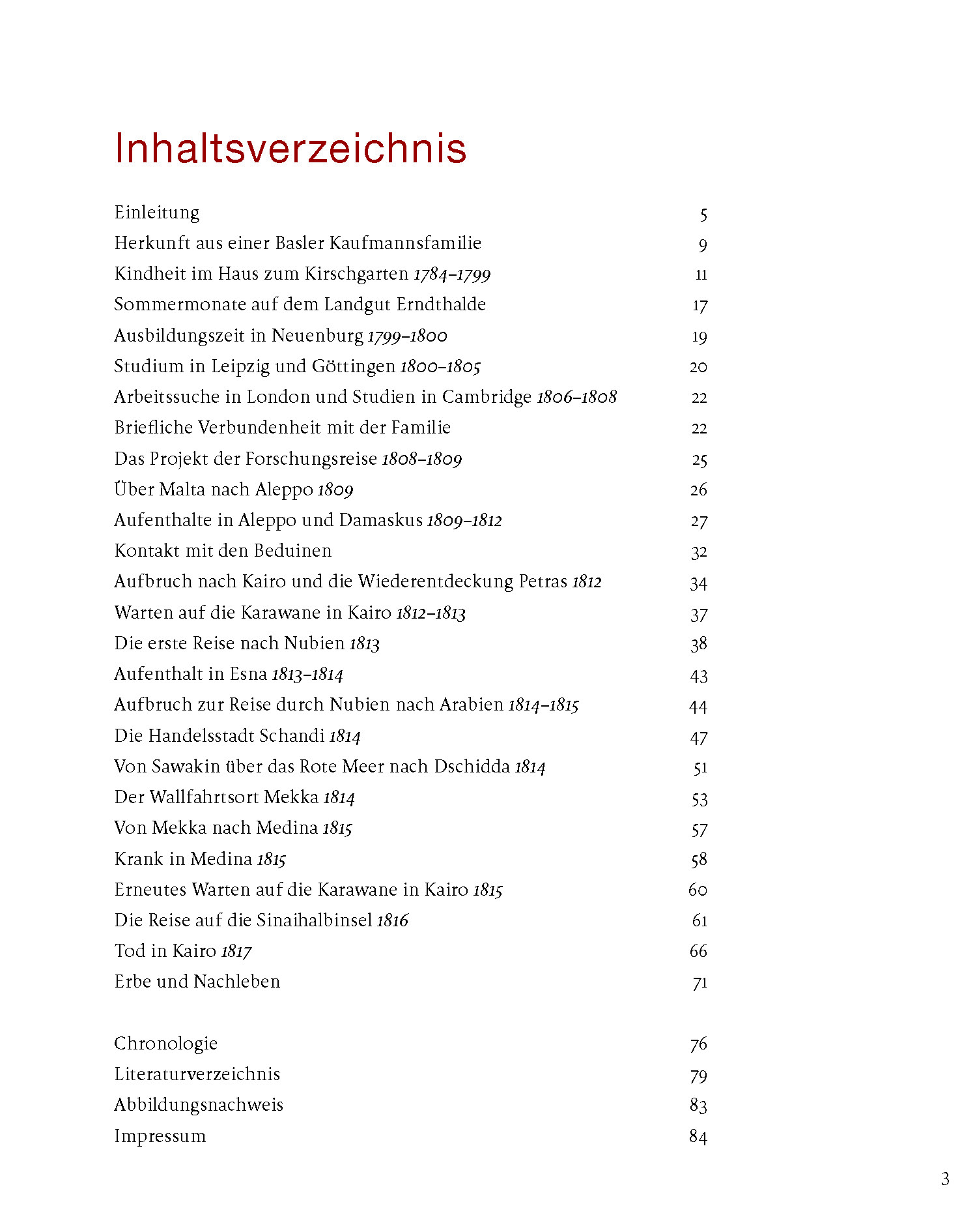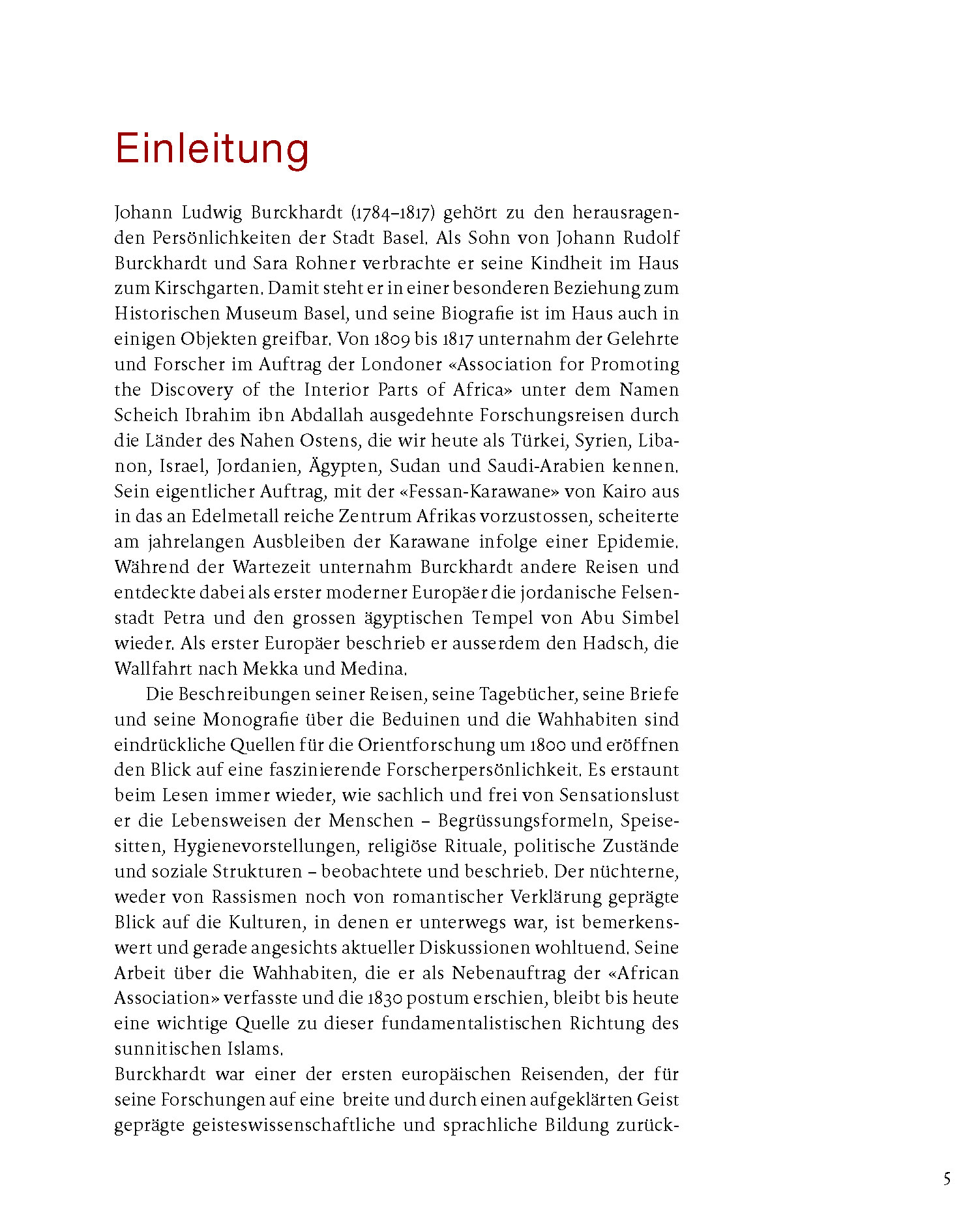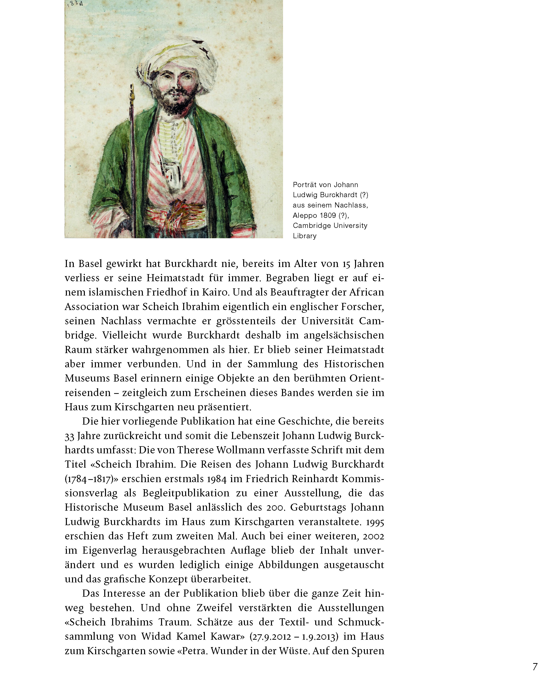 Die Biografie erzählt das Leben des Baslers Johann Ludwig Burckhardt, der als Sohn eines Handelsherrn seine Kindheit im Haus zum Kirschgarten verbracht hatte. Im Auftrag einer britischen Forschungsgesellschaft bereiste er unter dem Namen Scheich Ibrahim Ibn Abdalla zwischen 1809–1817 den Nahen Osten. Seine Fähigkeit, sich in fremde Kulturen einzuleben und dennoch objektiv über sie zu schreiben, macht ihn zu einem einzigartigen Zeitzeugen arabischer Lebenswelten. Für die Archäologie spielt Burckhardt als (Wieder-)Entdecker der Felsenstadt Petra und des grossen ägyptischen Tempels von Abu Simbel eine wichtige Rolle. Als einer der ersten Europäer beschrieb er zudem die Wahabiten, was einigen seiner Texte eine beklemmende Aktualität verleiht.